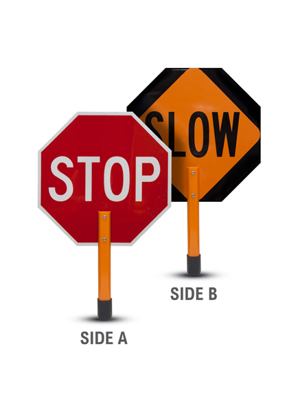 The Stop / Slow Handheld Paddle Sign features an 18” or 24″ octagonal sign with stop on one side and slow on the other side. This sign complies with the 2009 MUTCD which specifies in Section 6E.03 that stop/slow paddles shall have letters at least 6 inches high. The stop face shall have white letters and a white border on a red background. The slow face shall have black letters and a black border on an orange background. When used at night the paddle shall be retro-reflectorized. The smooth finish round orange handle not only stands out but allows for easily adding an extension handle to make holding the sign easier to hold for long periods of time.